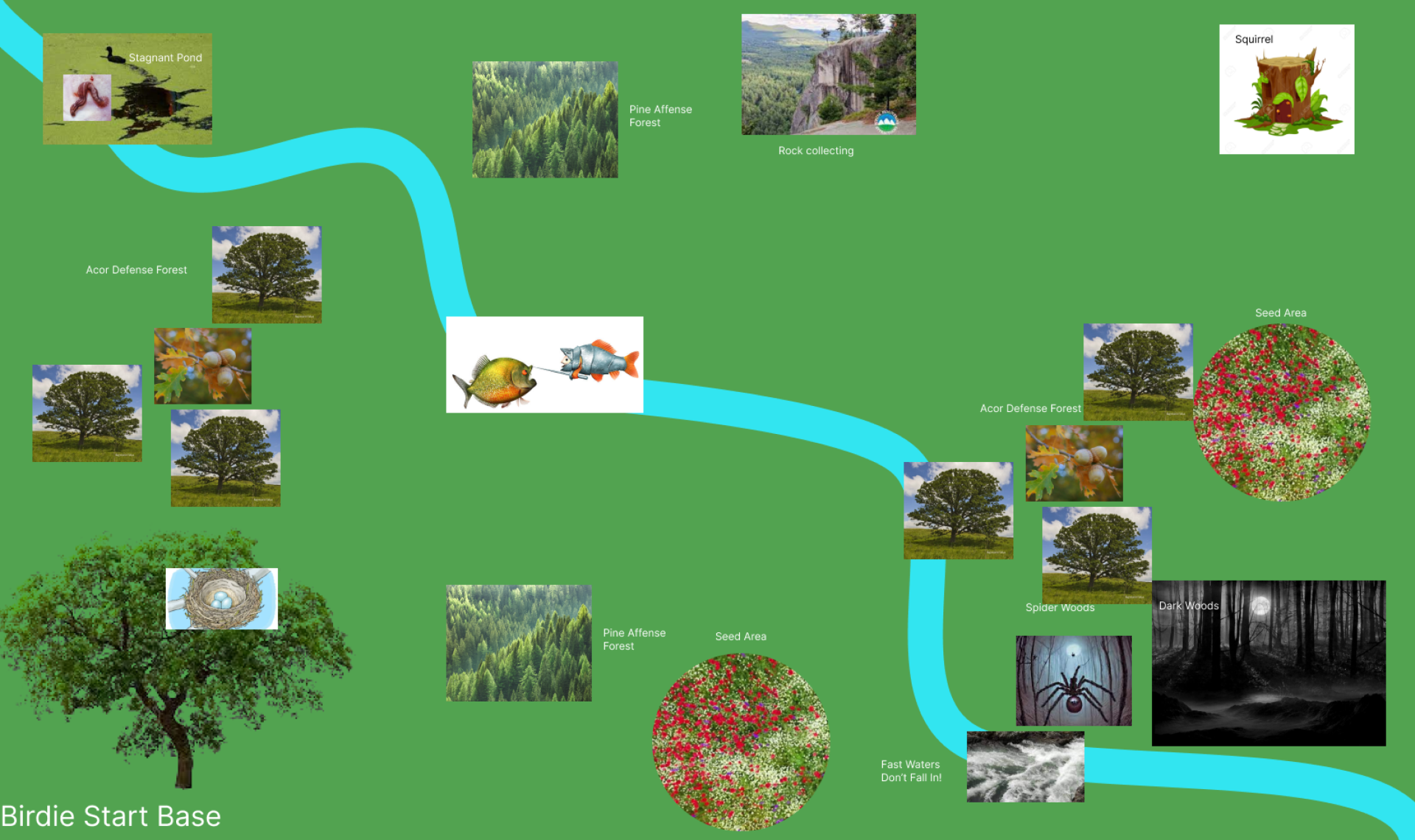 From the start, we wanted to challenge ourselves to make a 2 player game. After some initial brainstorming, we came up with pitting birds and squirrels against each other for seeds in the forest. But the details were still blurry. We sat down and started listing out ideas for how these birds and squirrels would interact with each other.